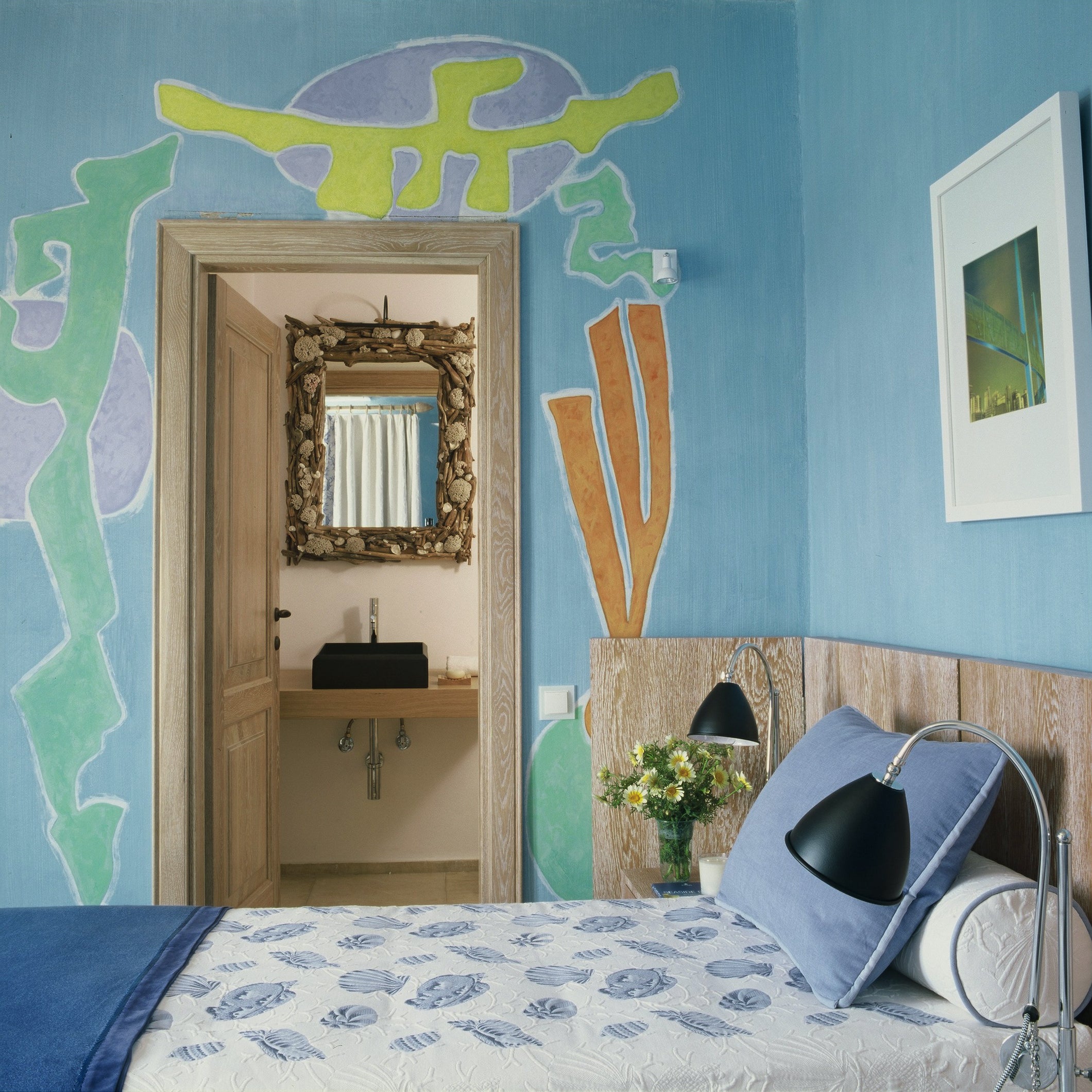 Surplombant les bleus éclatants de la mer Égée, cette villa de Mykonos s’affirme comme un refuge baigné de lumière, où l’architecture d’intérieur se nourrit d’art et de poésie. Dès l’entrée, les murs turquoise peints à la chaux donnent le ton : un univers graphique et solaire, animé par des fresques murales aux accents mythologiques, comme autant de clins d’œil à l’histoire grecque.