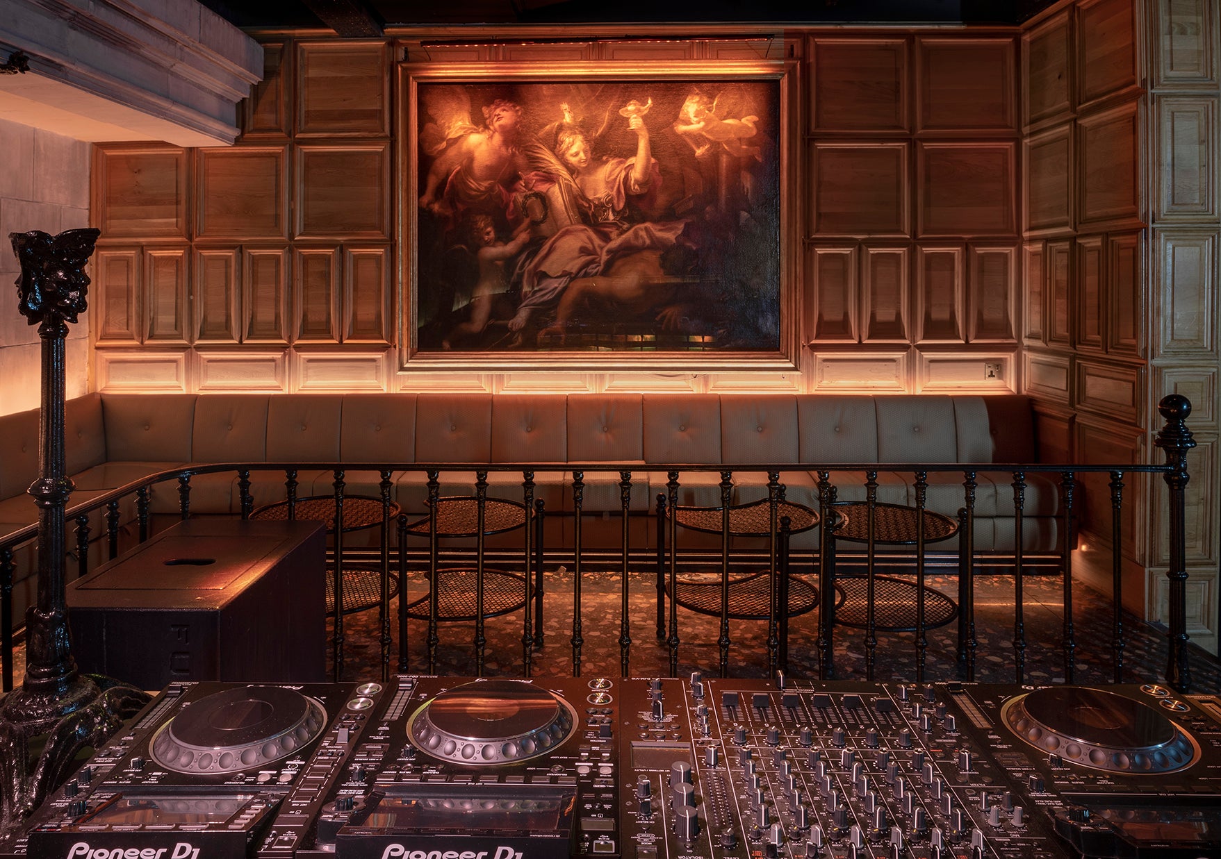 L’entrée, théâtrale, s’ouvre sur un escalier baigné de néons violets et dominé par un portrait mystérieux. À l’intérieur, chaque zone offre une atmosphère unique : bar sur mesure, alcôves confidentielles, salons enveloppants, jeux de lumière, matériaux nobles et finitions précieuses. Le tout orchestré autour d’un DJ booth spectaculaire qui signe la vocation festive du lieu.