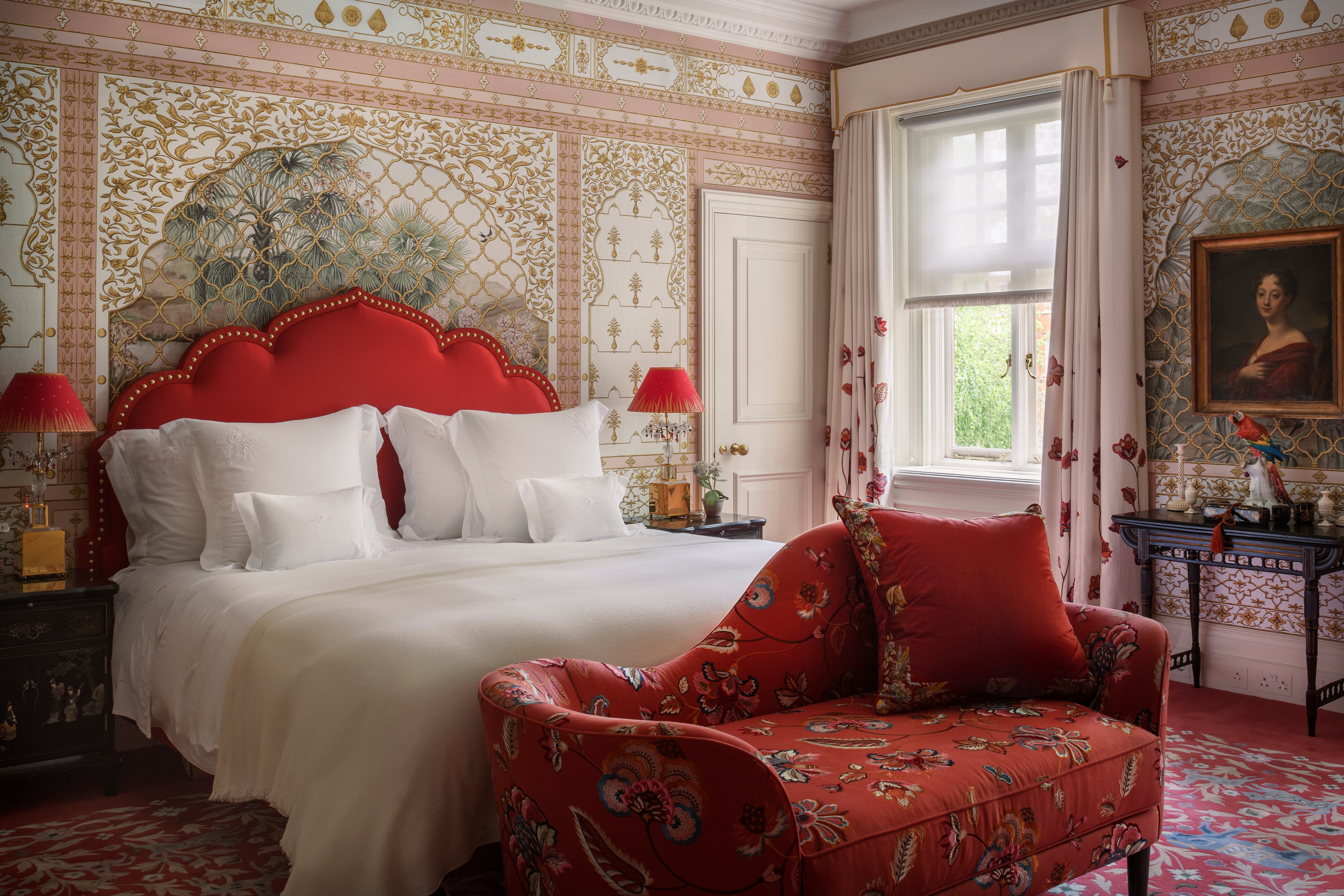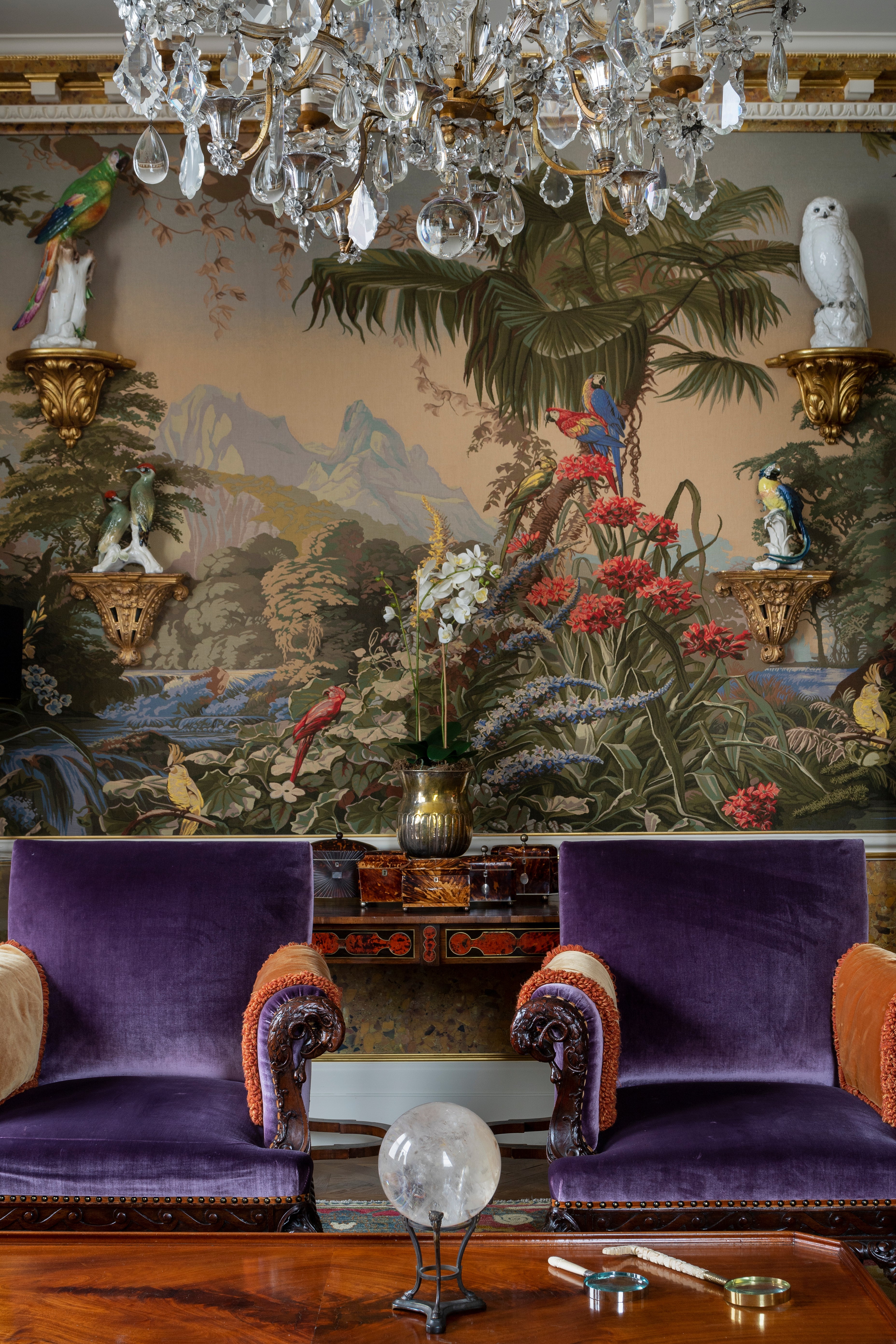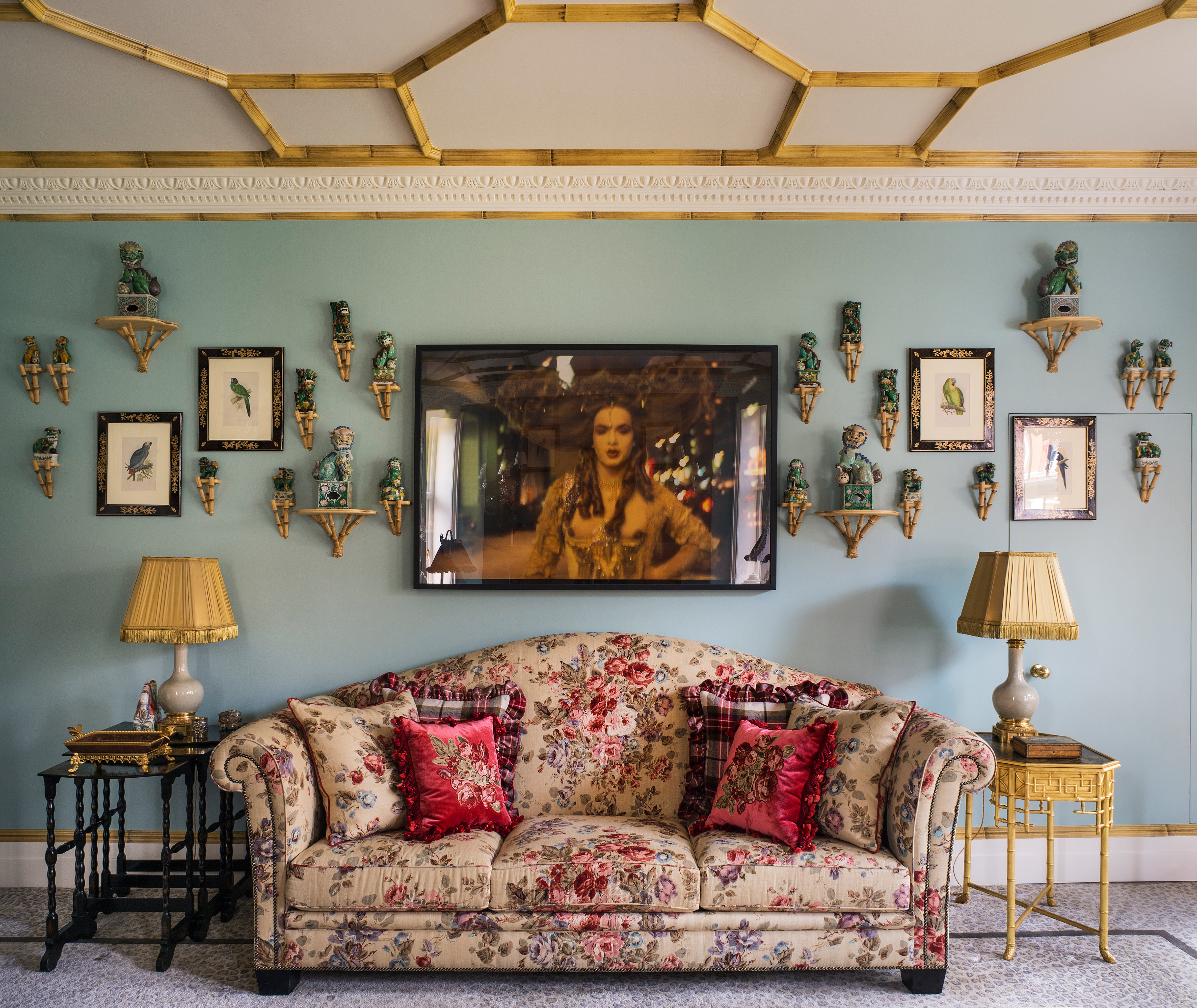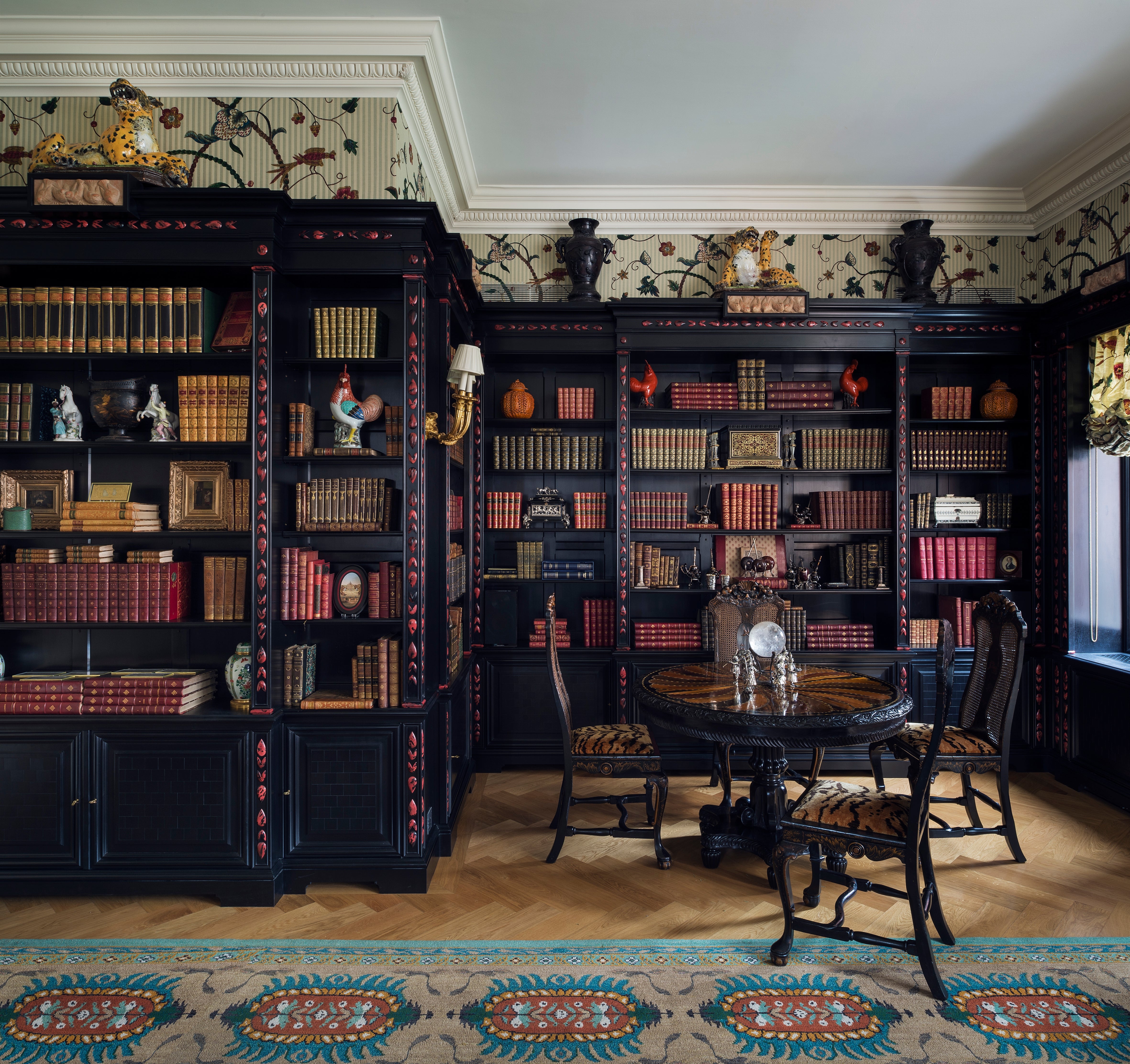 Les deux salons affirment des identités contrastées. Le premier assume une fantaisie audacieuse, entre collages, sol léopard, tartan cramoisi et plafond à motif bambou évoquant l’univers Wedgwood. Le second, plus dense, se déploie sur un fond de coton fleuri, où mobilier sombre, bibliothèque noire et paravent en cuir peint et embossé instaurent une présence majestueuse, ponctuée de tartans aux accents écossais.
