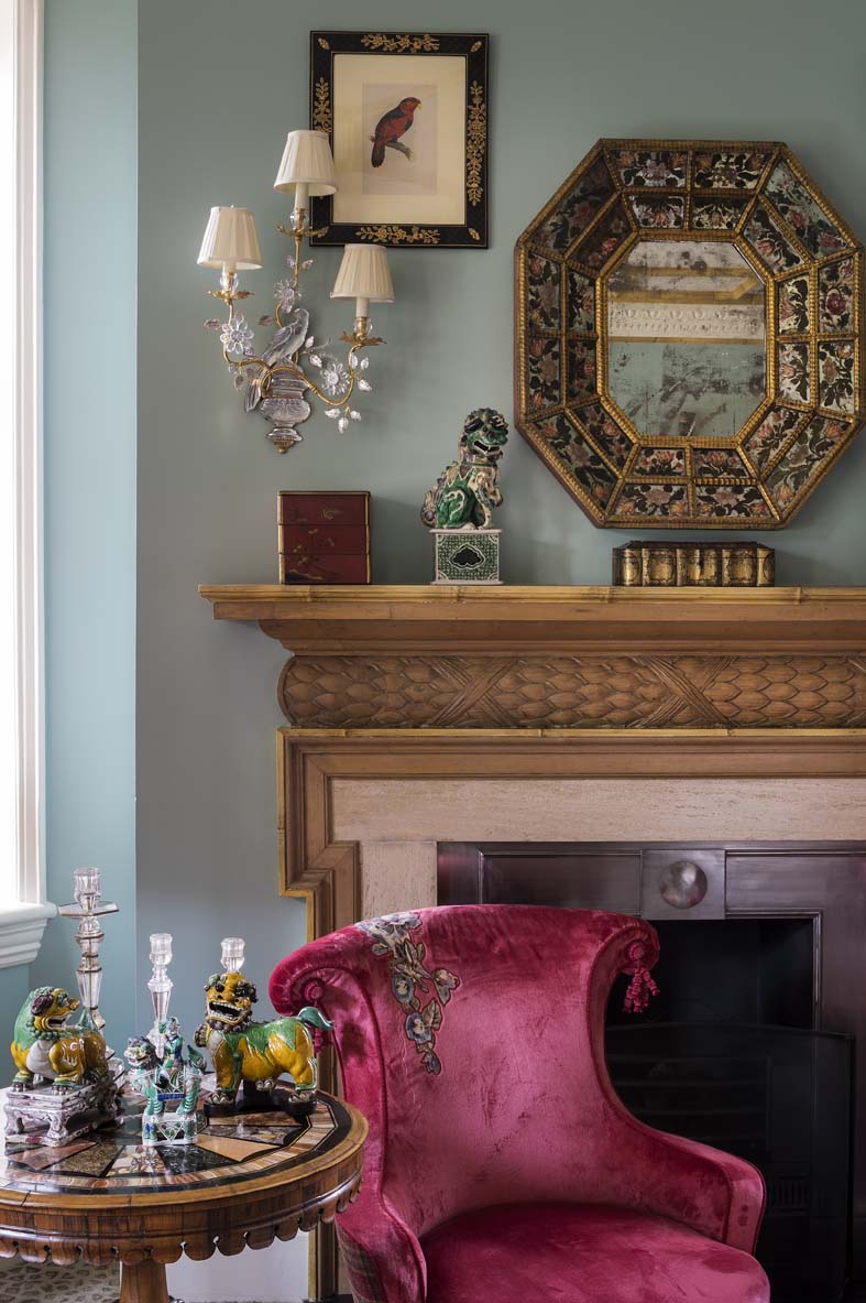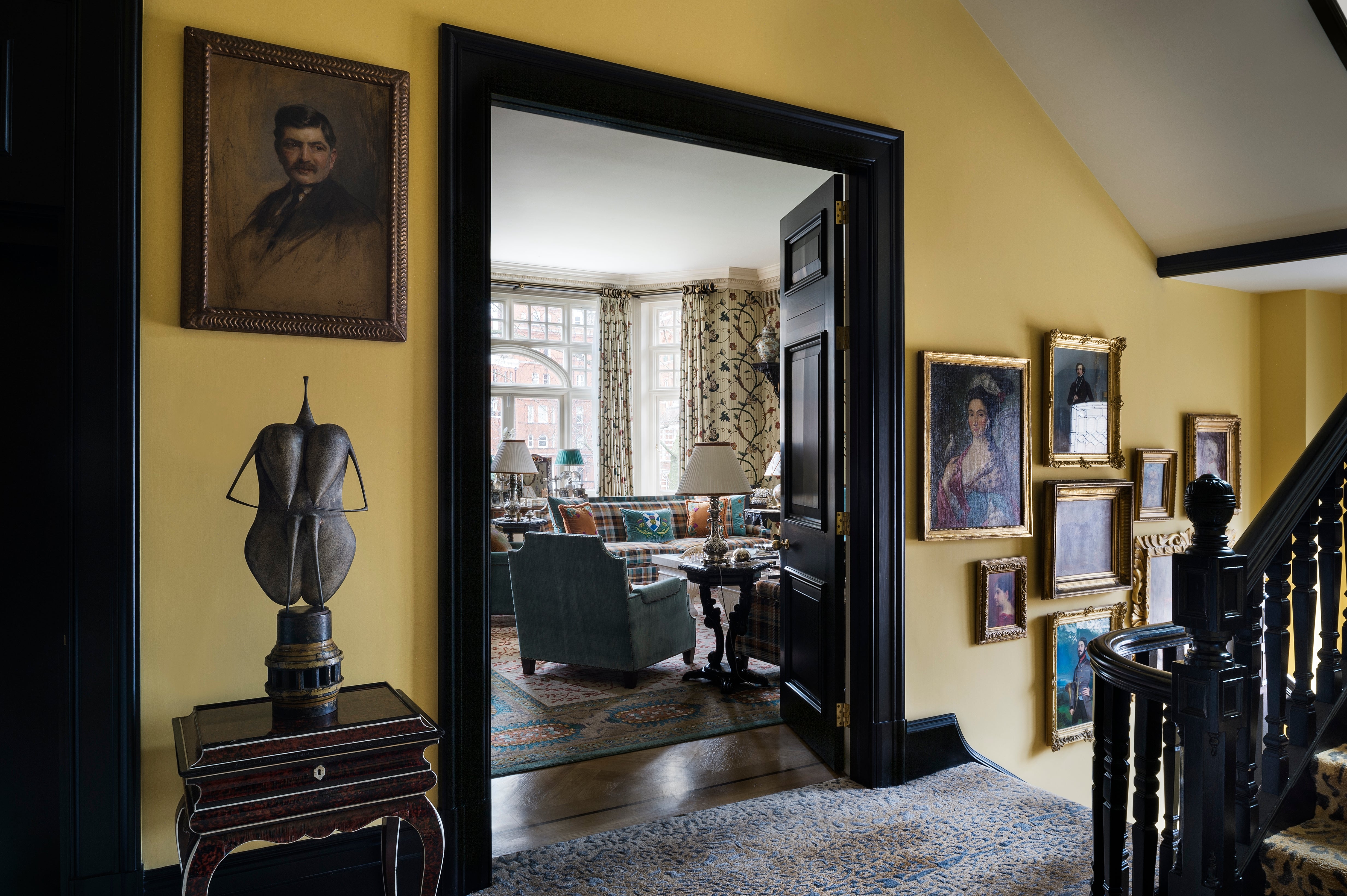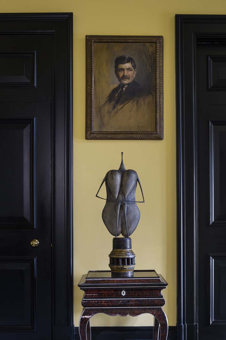 Organisée sur plusieurs niveaux reliés par un escalier habillé de portraits d’époques variées, la maison décline à chaque étage une palette singulière de chamois, vert, bleu et jaune. Ces tonalités offrent un écrin subtil à une importante collection de pièces chinoises réunies au fil des voyages.