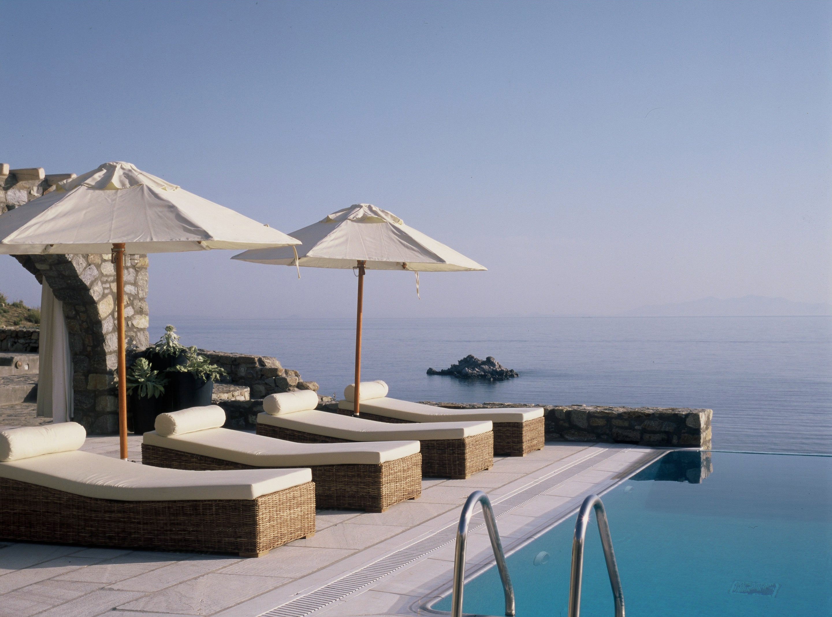 Le design d’intérieur joue ici sur une partition méditerranéenne revisitée. Les sols en pierre et les plafonds aux poutres blanchies accueillent un mobilier aux lignes organiques, des assises habillées de lin blanc, et des pièces artisanales en bois ou en céramique. Les matières naturelles – rotin, osier, pierre brute – se mêlent aux couleurs vives pour composer une atmosphère joyeuse et raffinée.