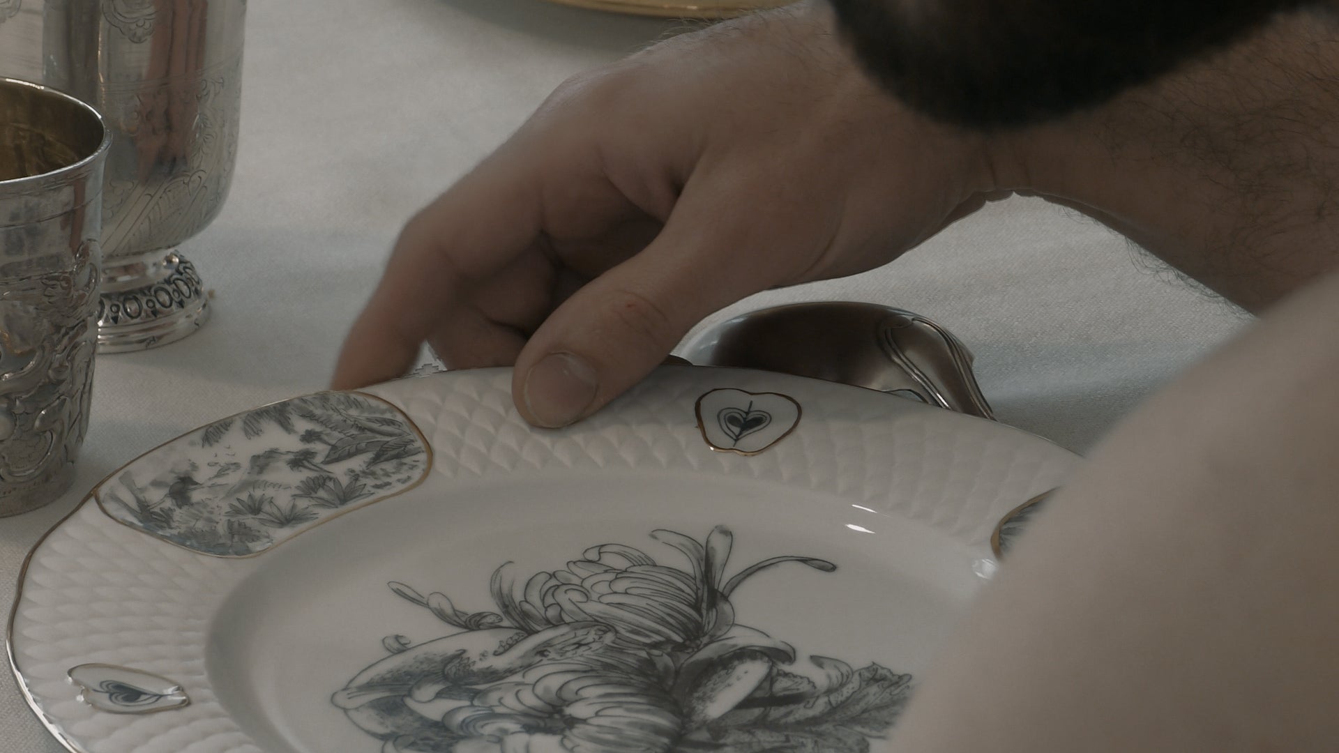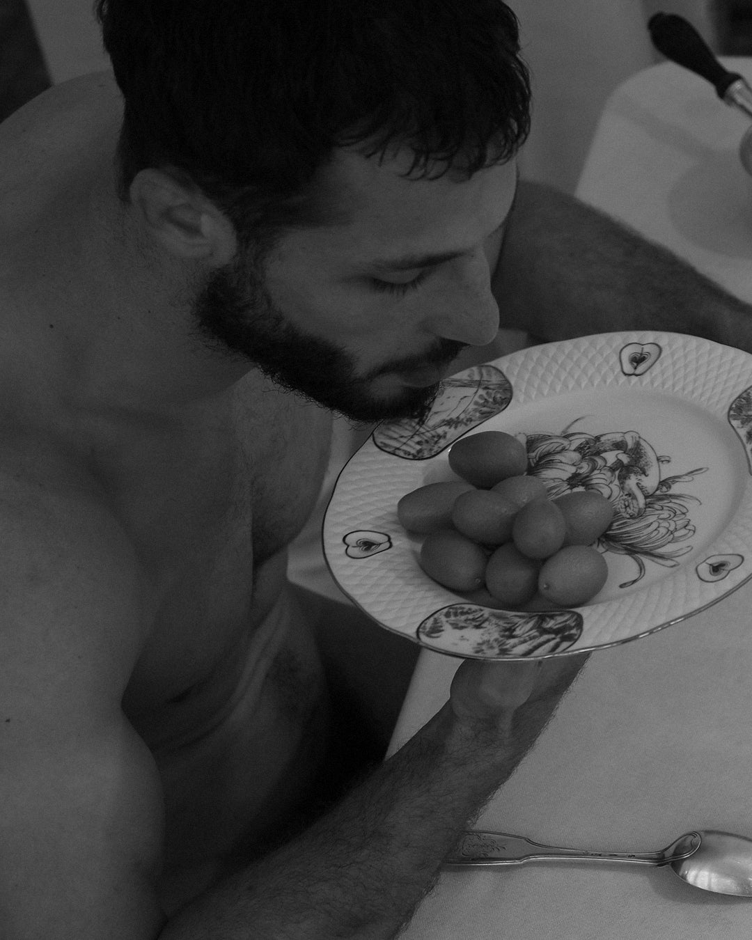Pour accompagner ce lancement, une mise en scène cinématographique a été réalisée par l’artiste Marc Martin, dont l’univers visuel mêle la frontalité du nu aux références classiques. Au cœur de la vidéo, le mannequin Mathis Chevalier incarne une figure suspendue entre mythe et mémoire. Assis à une table dressée pour six, il tient l’assiette comme une relique silencieuse, dans un décor oscillant entre contemplation, sensualité et disparition