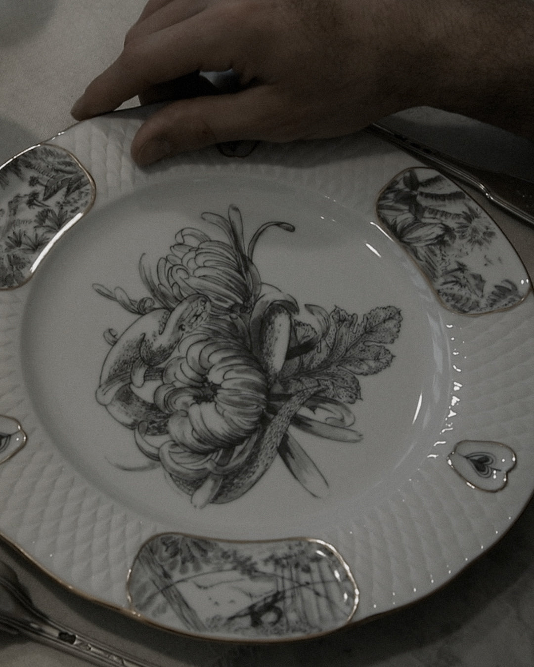 Fondée en 1789, la Manufacture de Couleuvre perpétue l’art de la porcelaine française depuis plus de deux siècles, en conservant un geste artisanal transmis de génération en génération. Pour cette collaboration, la Manufacture a conçu un modèle exclusif pour la Maison Pinto, réinterprétant son motif écaille historique avec un travail raffiné sur le marli et un dessin original de Pietro Scaglione, Directeur Artistique de la Maison Pinto. Ensemble, ils présentent une assiette « Dîner » aux lignes ondulées et au décor noir et or, où gravures botaniques et symboles classiques de vanité évoquent la fragilité du vivant et le vide originel d’avant la chute, avant la pomme.
